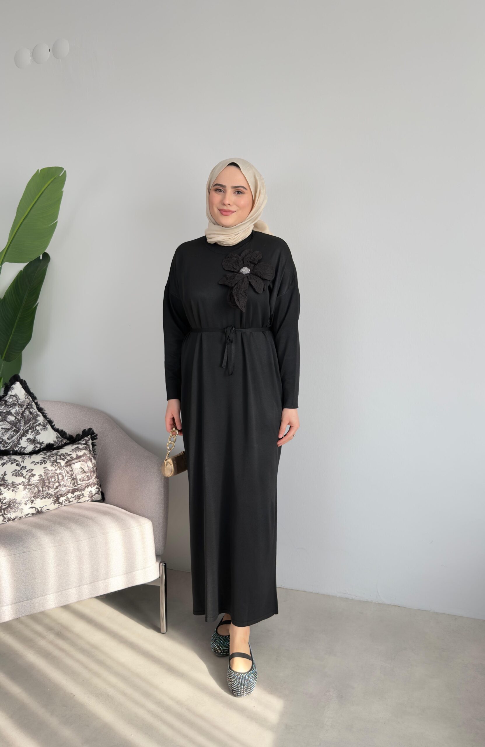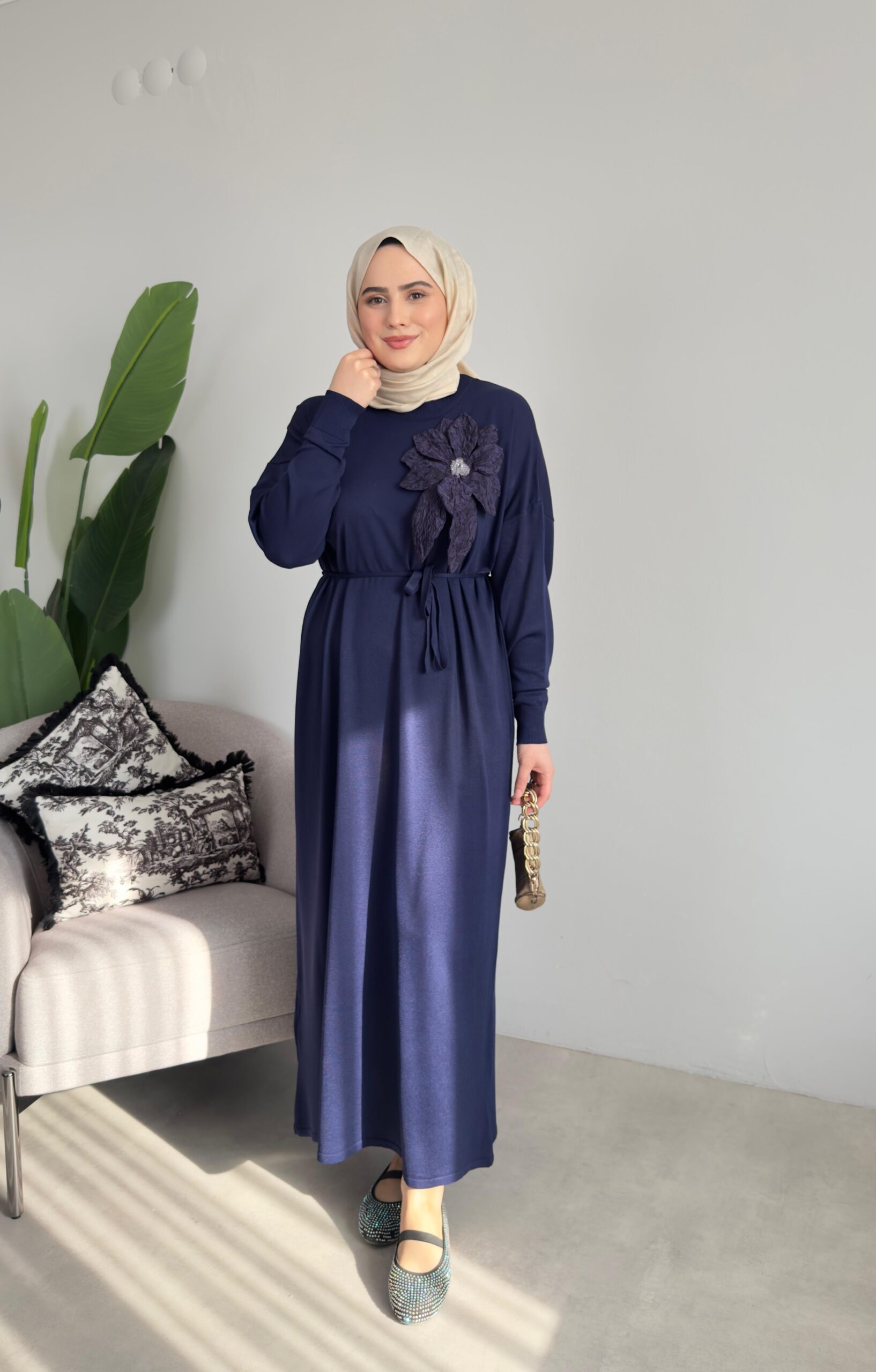 Çiçek Detaylı Merserize Elbise | Lacivert