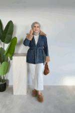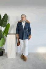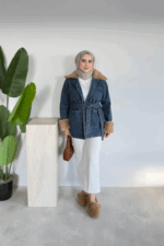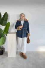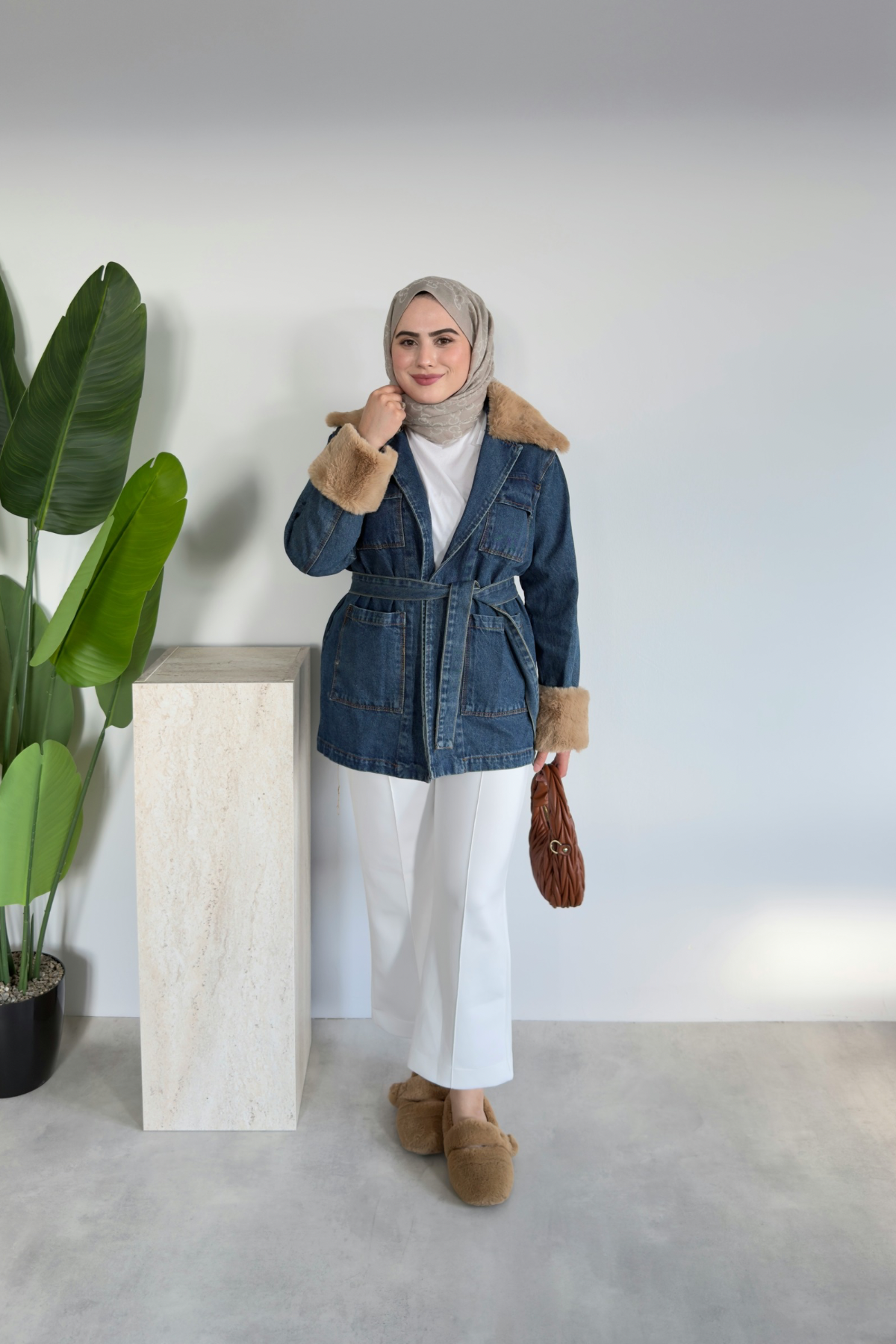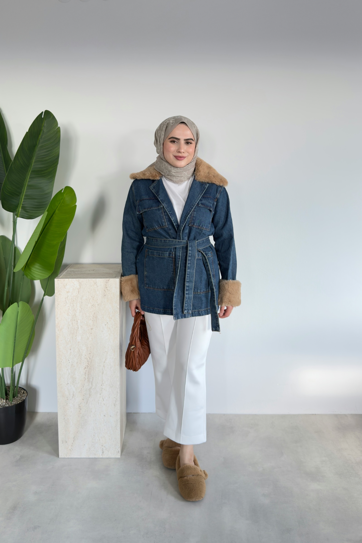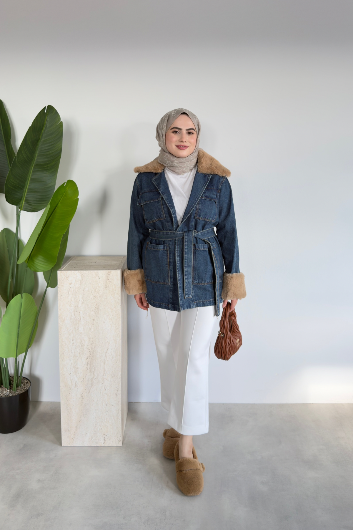 Zerda Kürk Detaylı Denim Ceket – Koyu Mavi