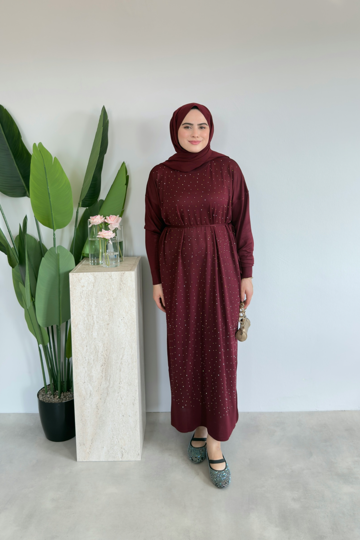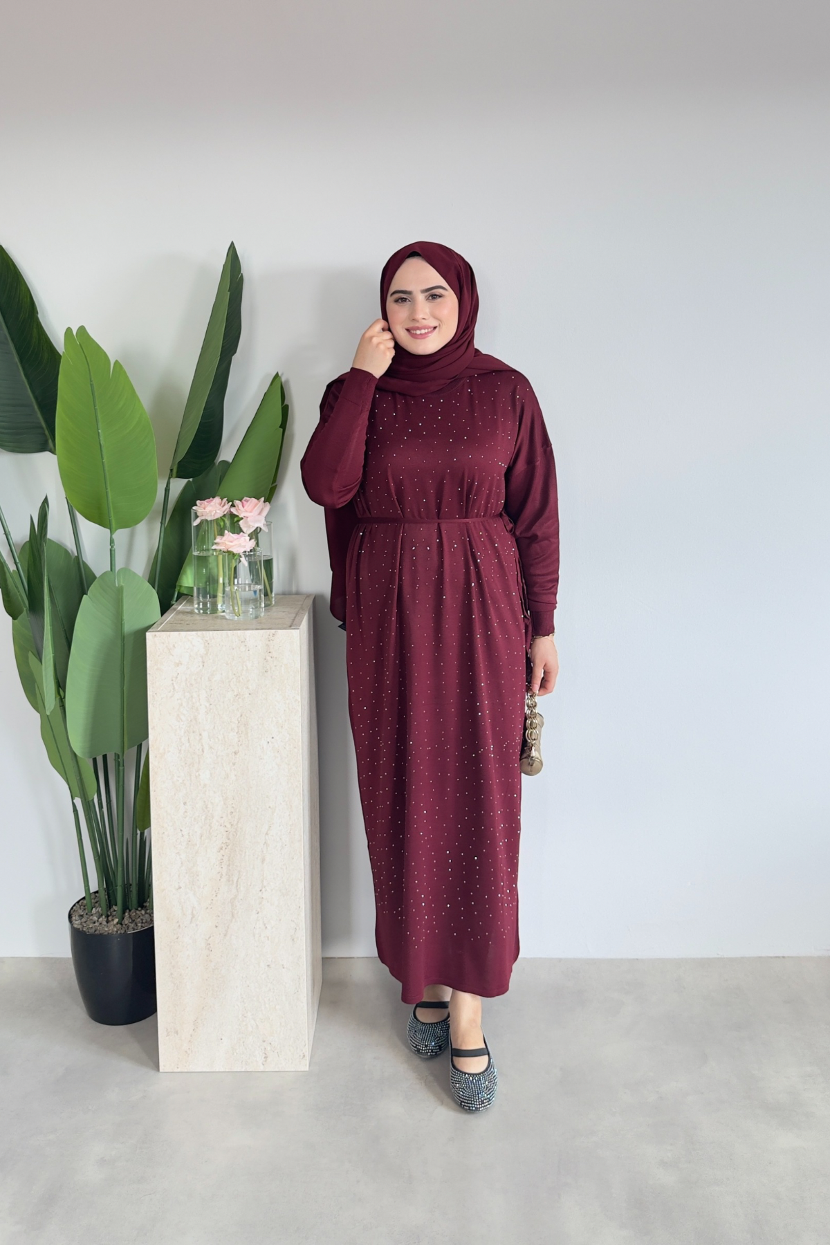 Merserize Taşlı Elbise | Bordo