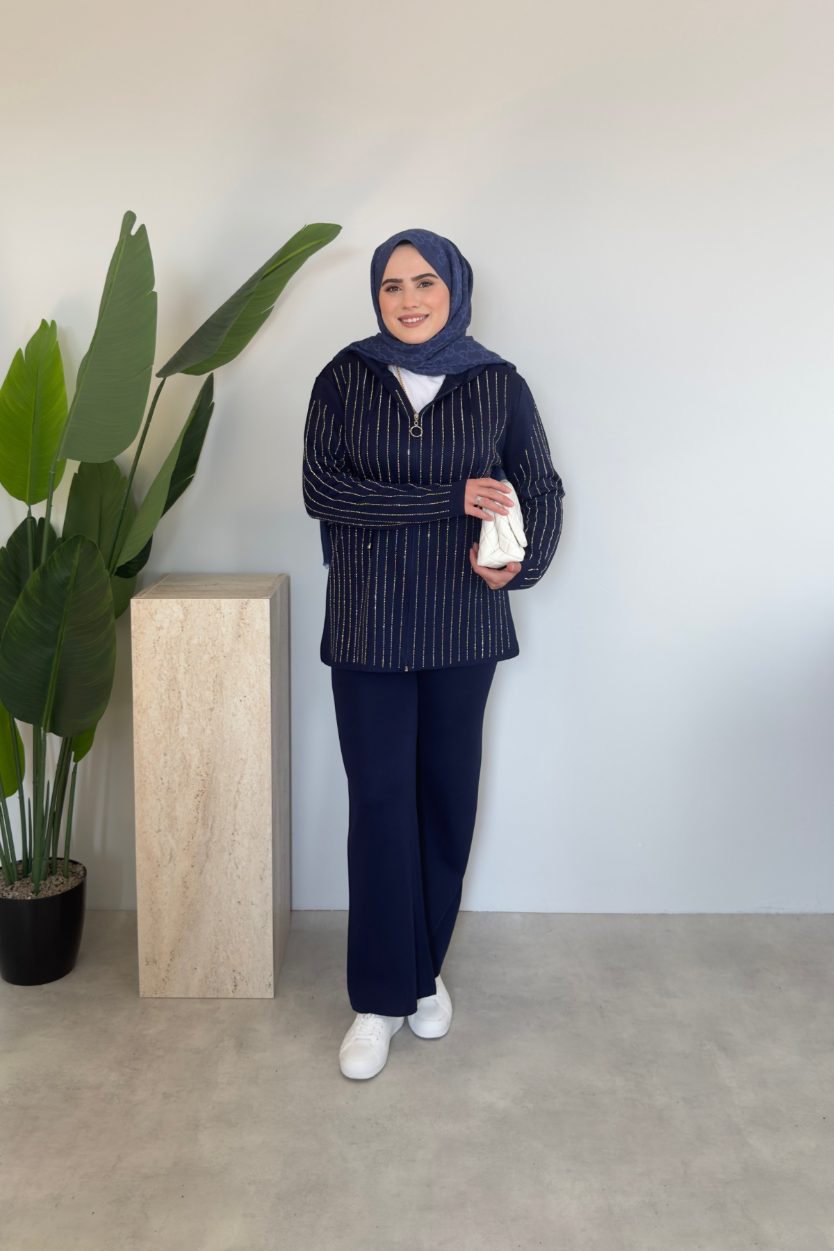 Kapüşonlu Taşlı Triko Takım- Lacivert